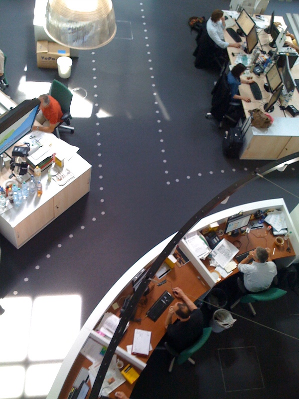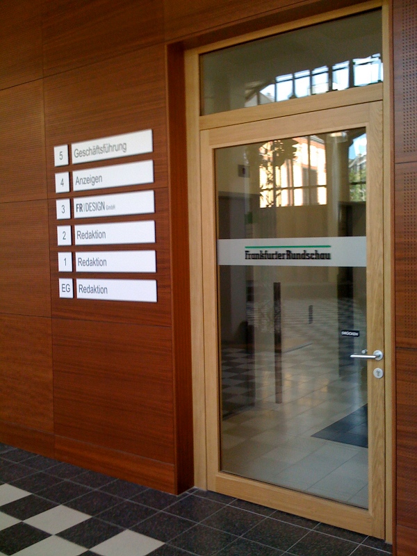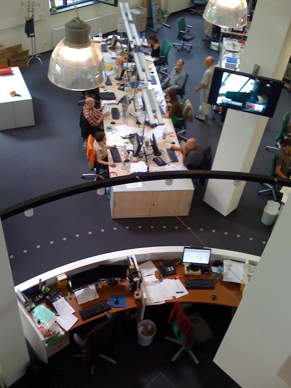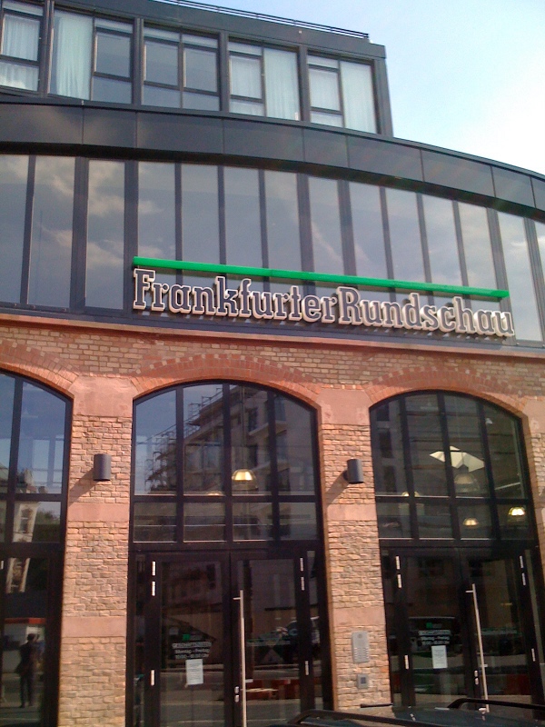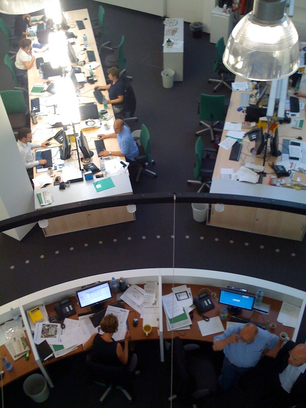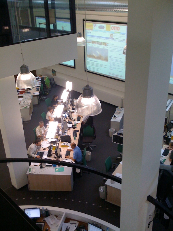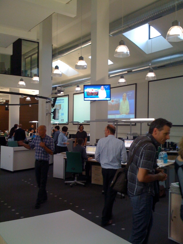 Alle Redakteure in einem Raum? Klingt nach einer Horrorvorstellung und ist auch eine, wenn man etwa den Newsroom der BBC oder der British Press Association vor Augen hat: Arbeitsbedingungen wie bei Batteriehühnern. Muss aber gar nicht so schlimm sein. Vor einer Woche war ich bei der Frankfurter Rundschau. Die FR setzt in ihrem neuen Redaktionshaus am Frankfurter Südbahnhof auf die Newsroom-Idee, und sie setzt sie äußerst geschmackvoll um. Hier einige Eindrücke.