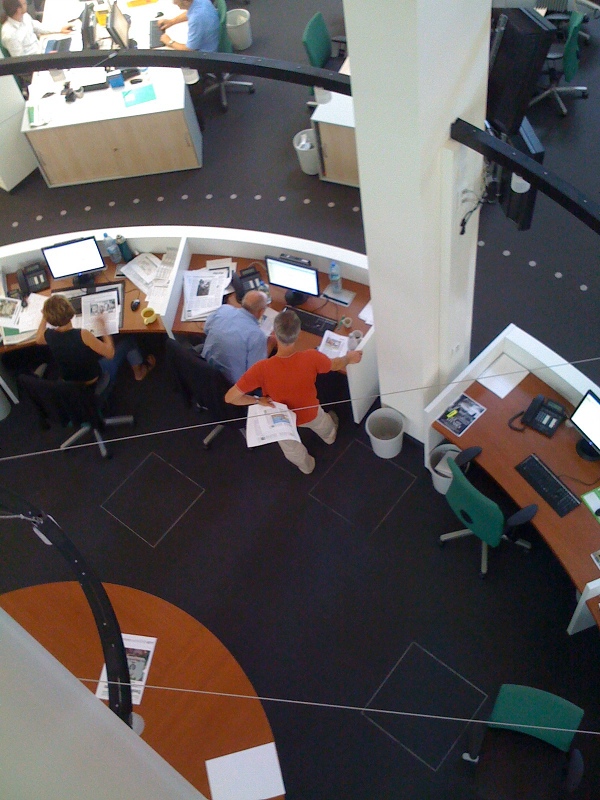Der Newsroom folgt einem „Nabe-und-Speichen“-Design: An den „Speichen“, langen Tischen, die auf die Mitte zuführen, sitzen die Ressorts; an der „Nabe“, dem runden Tisch in der Mitte, die leitenden Redakteure, die über den Tisch die Relevanz ihrer Themen aushandeln: Nach dem Gewicht der Story soll entschieden werden und nicht nach Ressorts. Mehr nachzulesen hier bei der FR selbst (mit einer Infografik, die es erleichtert, sich das Ganze vorzustellen).