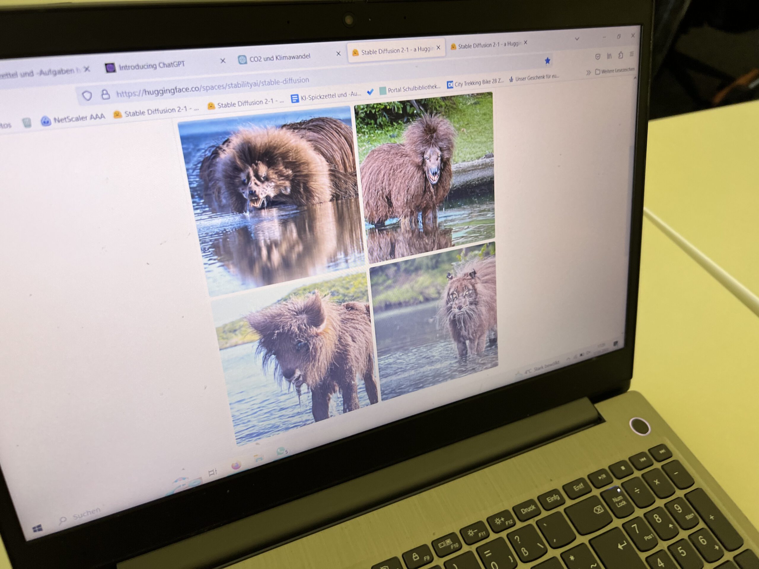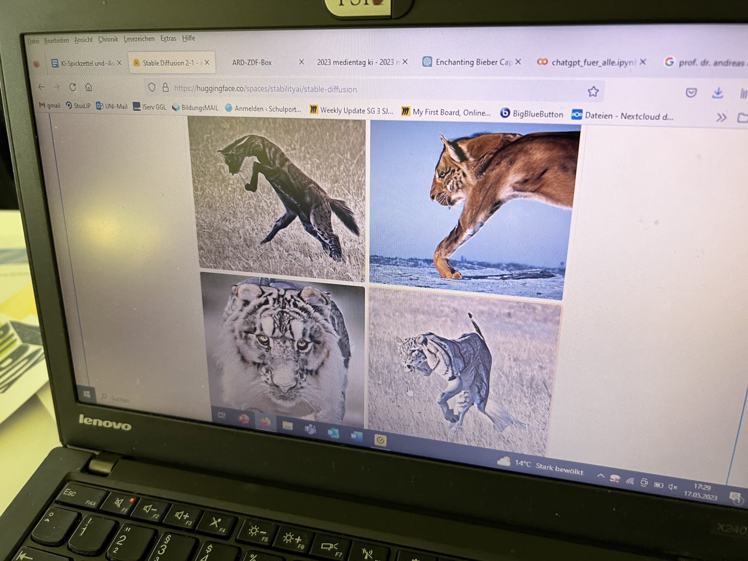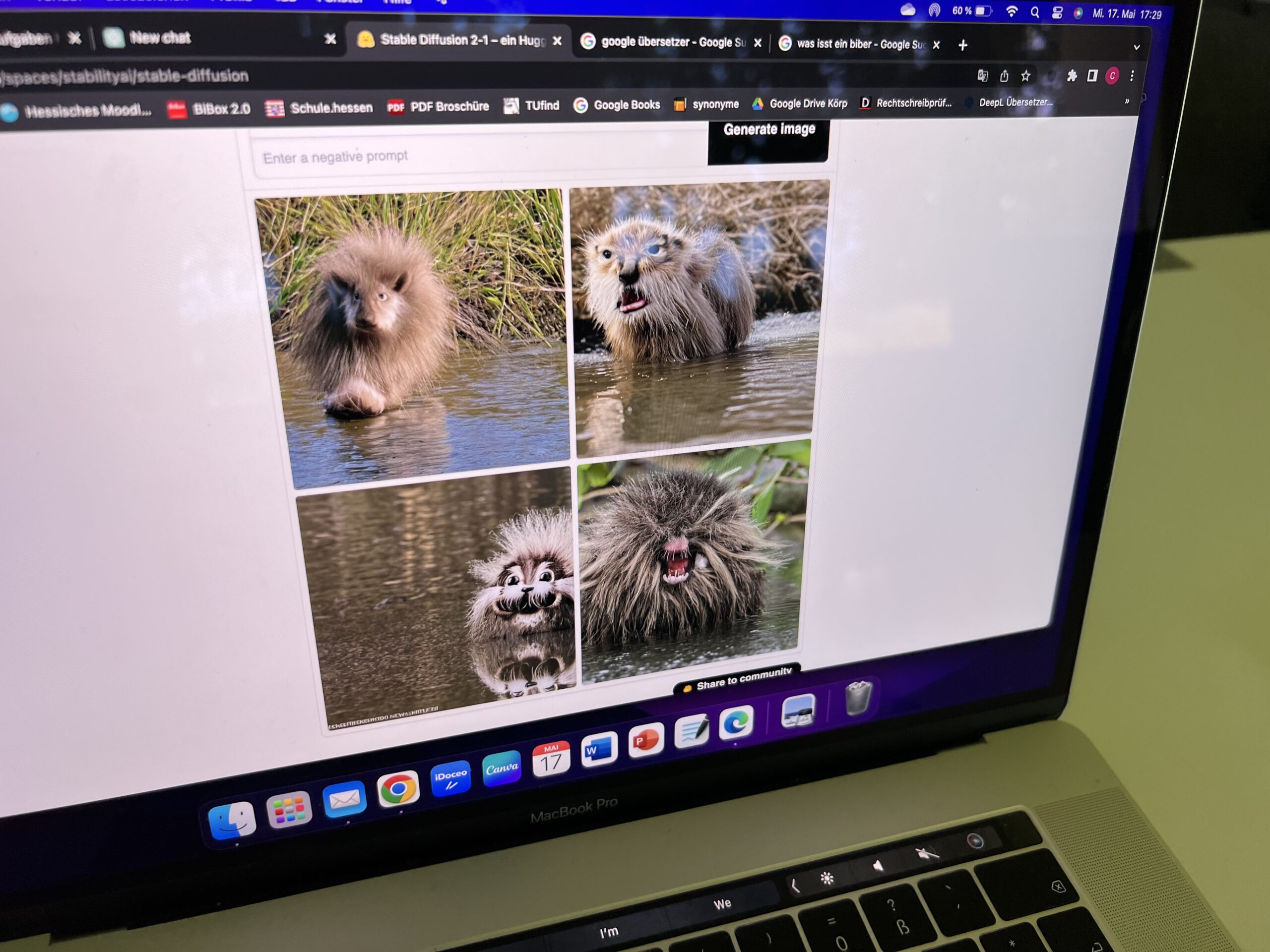 Einen KI-generierten Biber hinzubekommen, ist ohnehin nicht einfach. Case in point: mein Titelbild für diesen Artikel. Ich wollte von Midjourney und Dall-E2 einen Roboter haben, der einen Biber malt; bekommen habe ich entfernt biberartige Bären, die – wenn ich Glück hatte – irgendwas malen. Und beim Tabu-Spiel mit StableDiffusion, ohne die verbotenen Worte, führen die ersten Versuche erst mal zu Alptraum-Wolpertingern. (Übrigens: Wer verhindern will, dass die Beschreibung eines Tiers mit großen Zähnen zu einer Art Tiger führt, sollte „Tiger“ gleich als negatives Prompt eingeben – das geht bei StableDiffusion ja recht einfach.) Hier ein paar Beispielbilder von Workshop-Teilnehmerinnen am hr-Lehrertag.