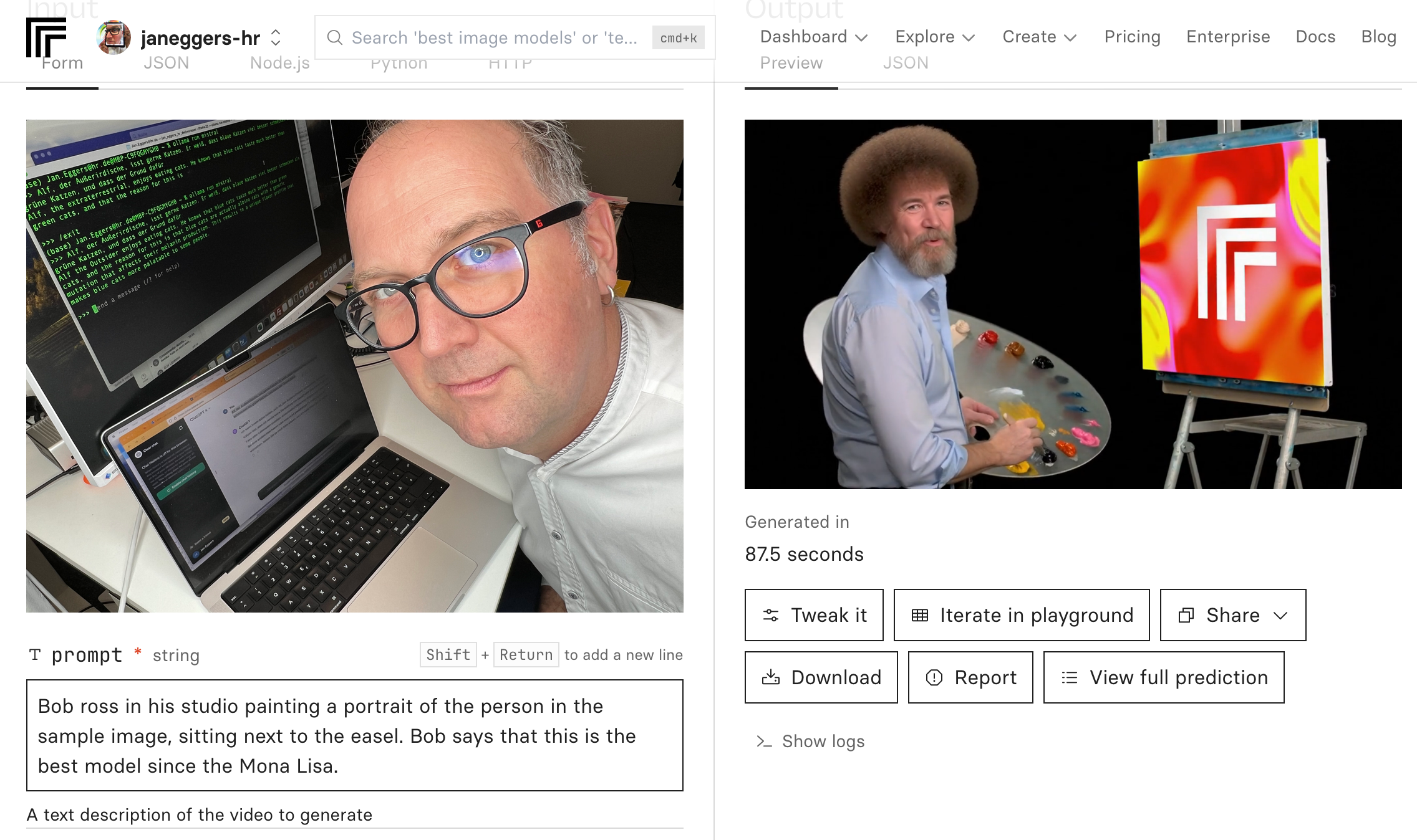 Sora 2 ist in Deutschland offiziell noch nicht erhältlich; über den API-Reseller Replicate kann ich das Modell aber anzapfen, ebenso wie Googles neuesten Veo3.1-Videogenerator. Als ich versuche, mit Sora 2 ein Video von mir mit dem Mem-Maler Bob Ross zu erzeugen, schreitet ein Filter ein: keine Videos mehr von real existierenden Personen.